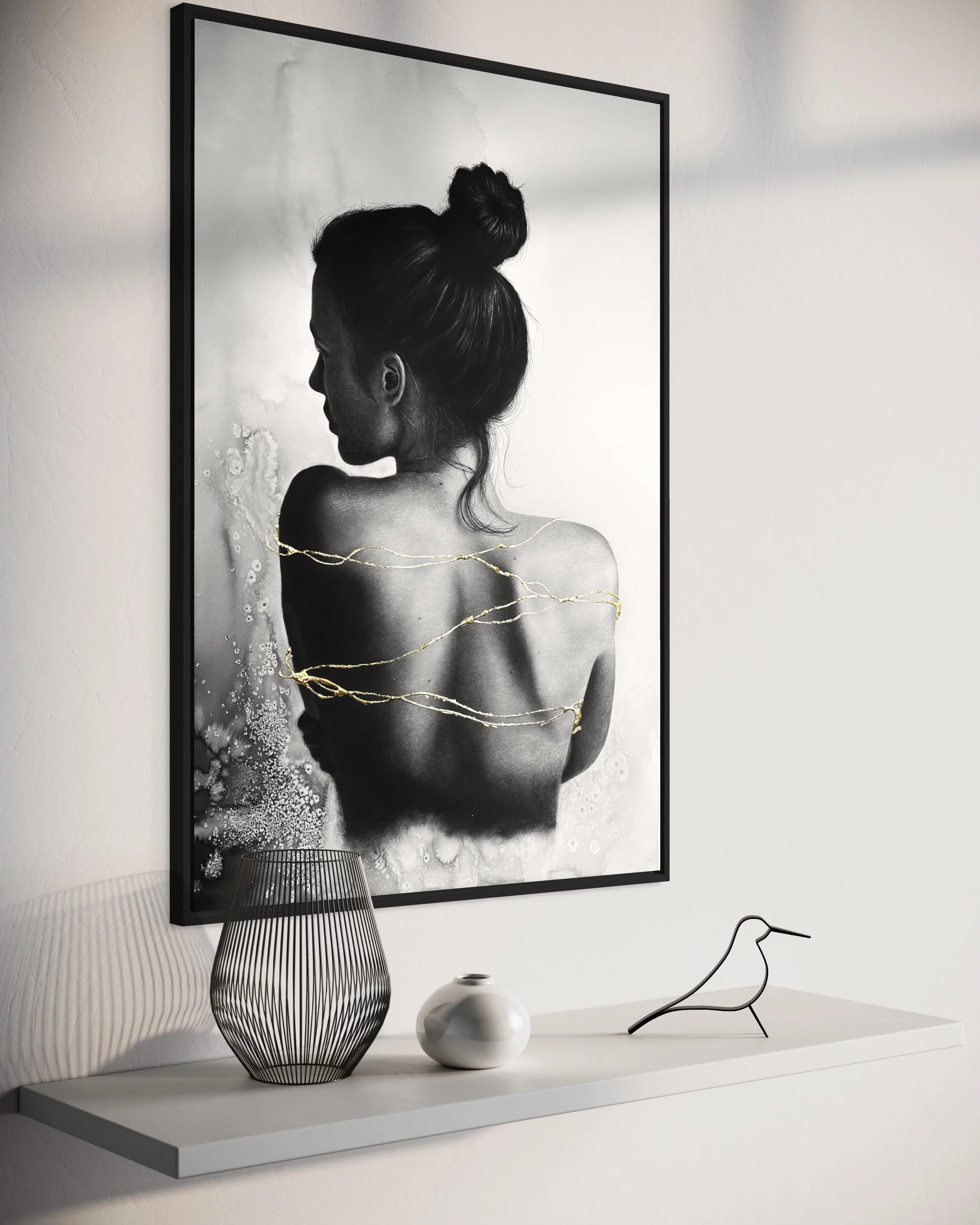 Charcoal, acrylic ink, gold leaf, UV print on Hahnemühle Museum Etching paper (350 gsm).
